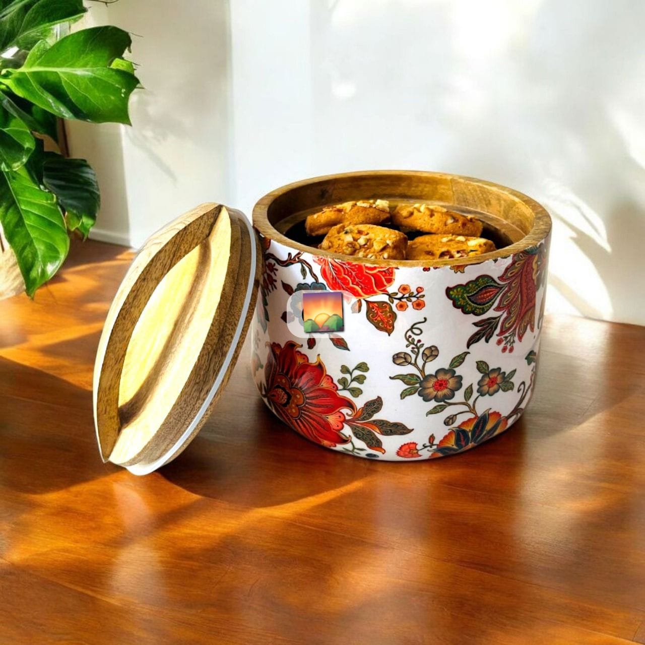 Wooden Bowl Jar With Airtight Lid Size - 6x5 Inch Material - Lacquer Coating on wood and Epoxy Coating on Printing